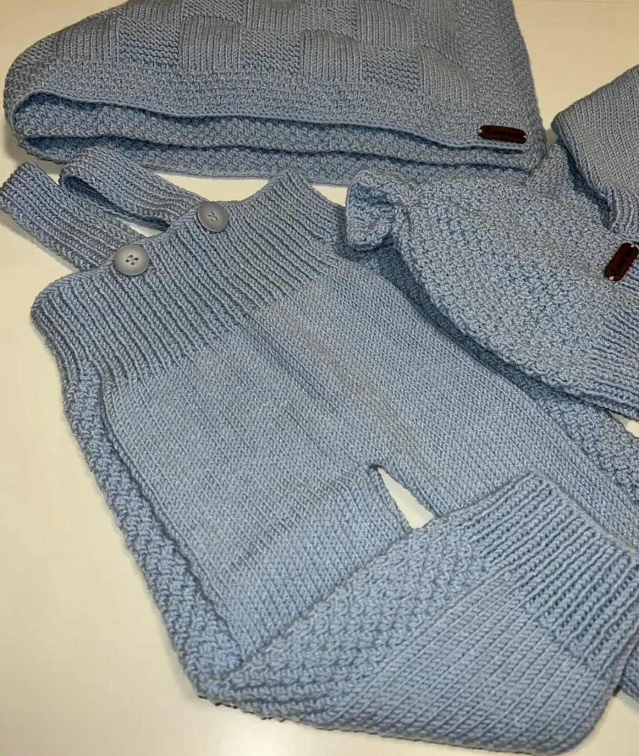 Set con salopette a bretelle a gamba lunga, cappuccio e copertina.