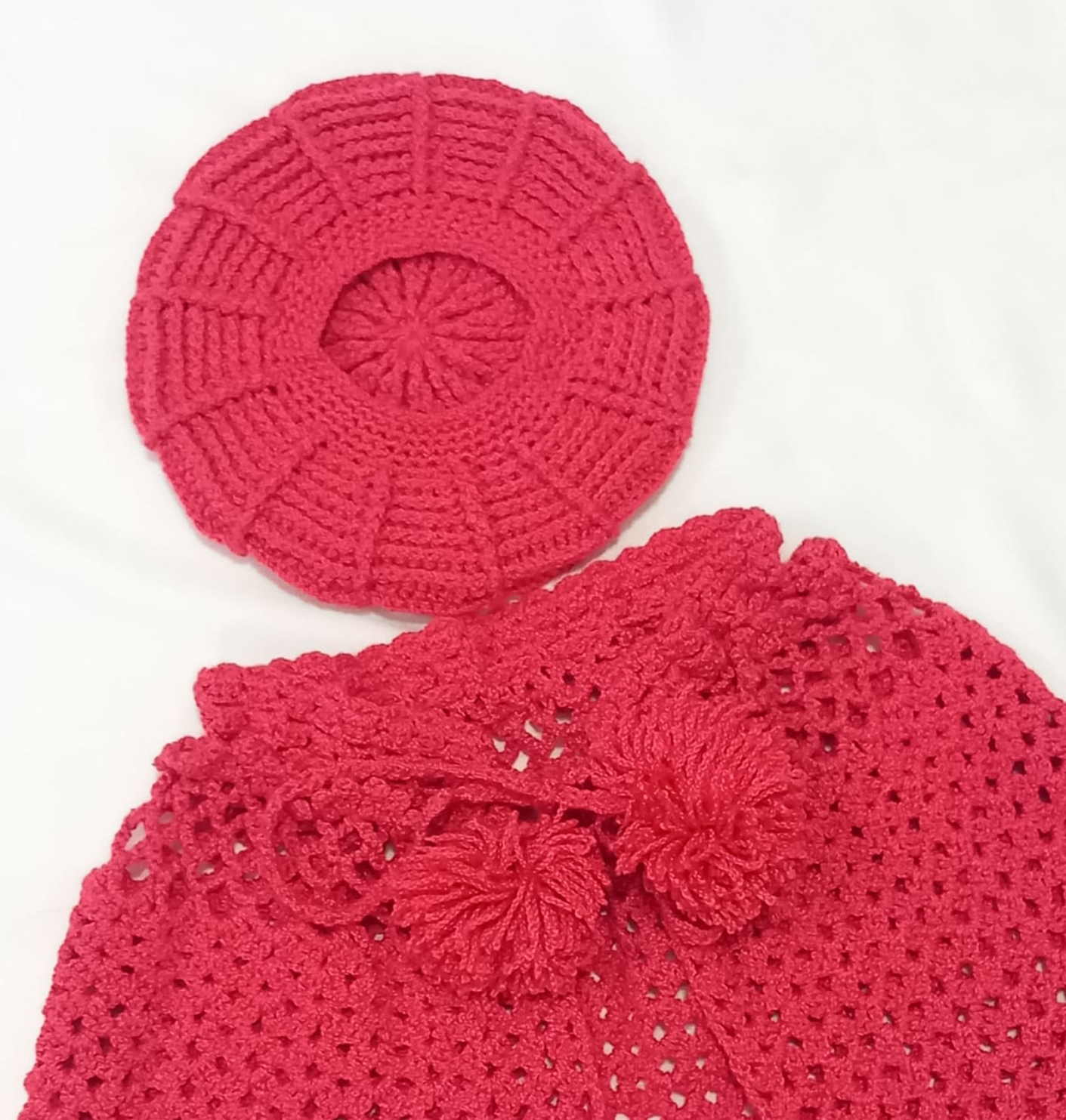 Morbido e comodo, questo set in 70% acrilico e 30% cotone include un coprispalle aperta e un cappello abbinato in rosa vivace, perfetto per bambine dai 3 ai 6 mesi.