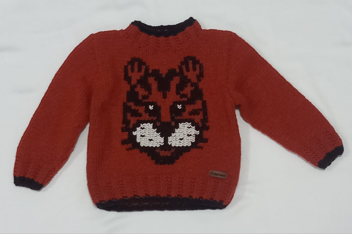 Divertente e originale, questa maglione in 100% acrilico presenta il motivo della faccia di tigre nei colori arancione, nero e bianco. Morbida e comoda, è perfetta per bambini dai 9 ai 12 mesi e lavabile a 30° delicato