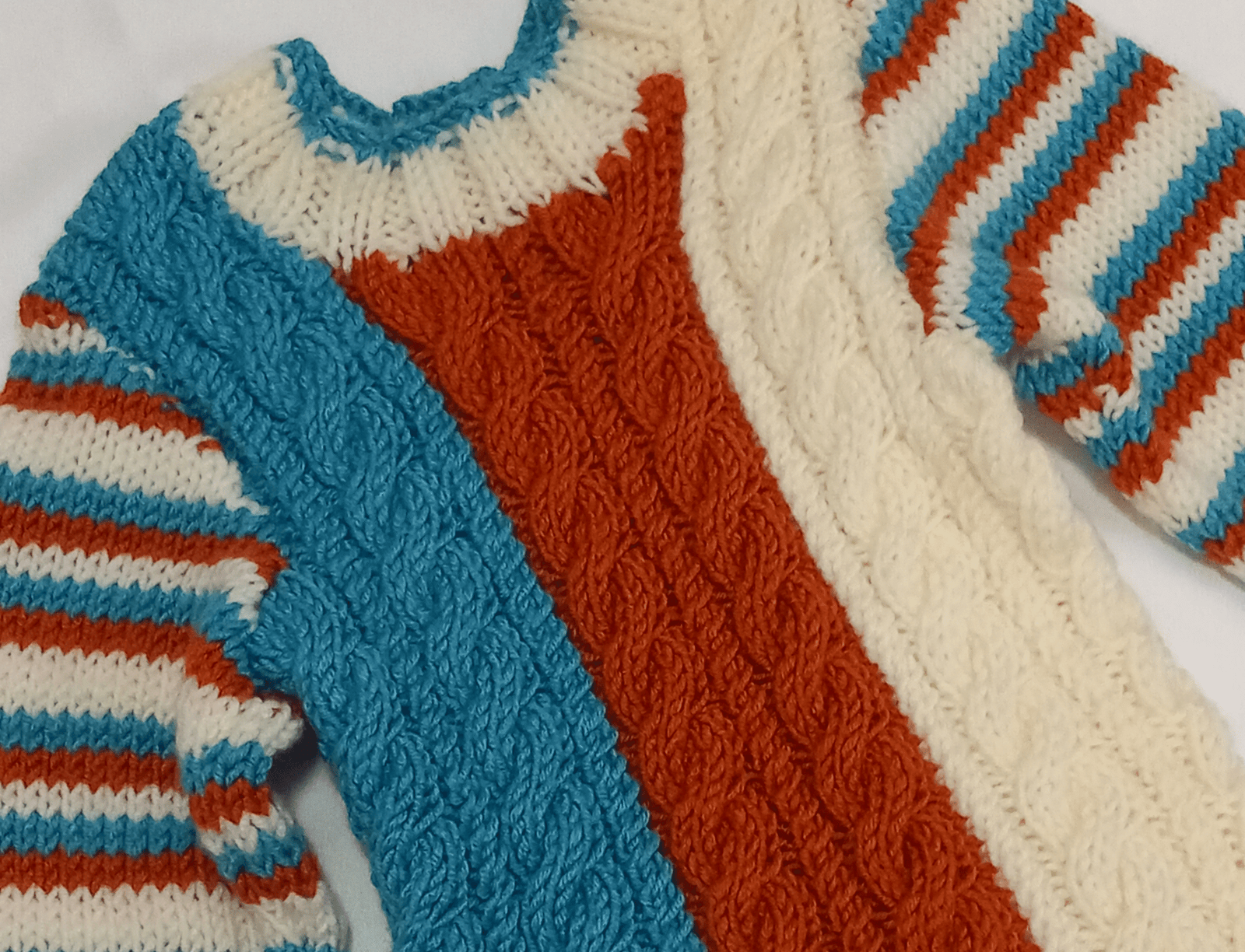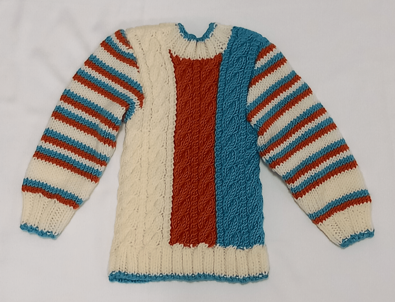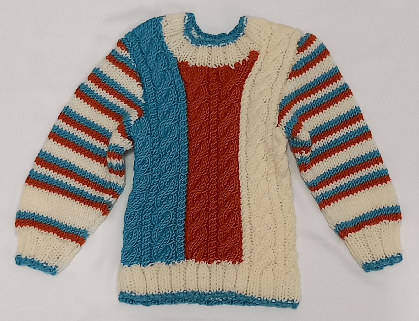 Maglione lavorato a mano , realizzato in 100% acrilico . Caldo e confortevole , con design multicolore , ideale per l’uso quotidiano .