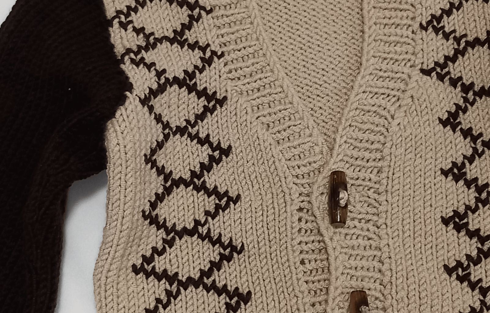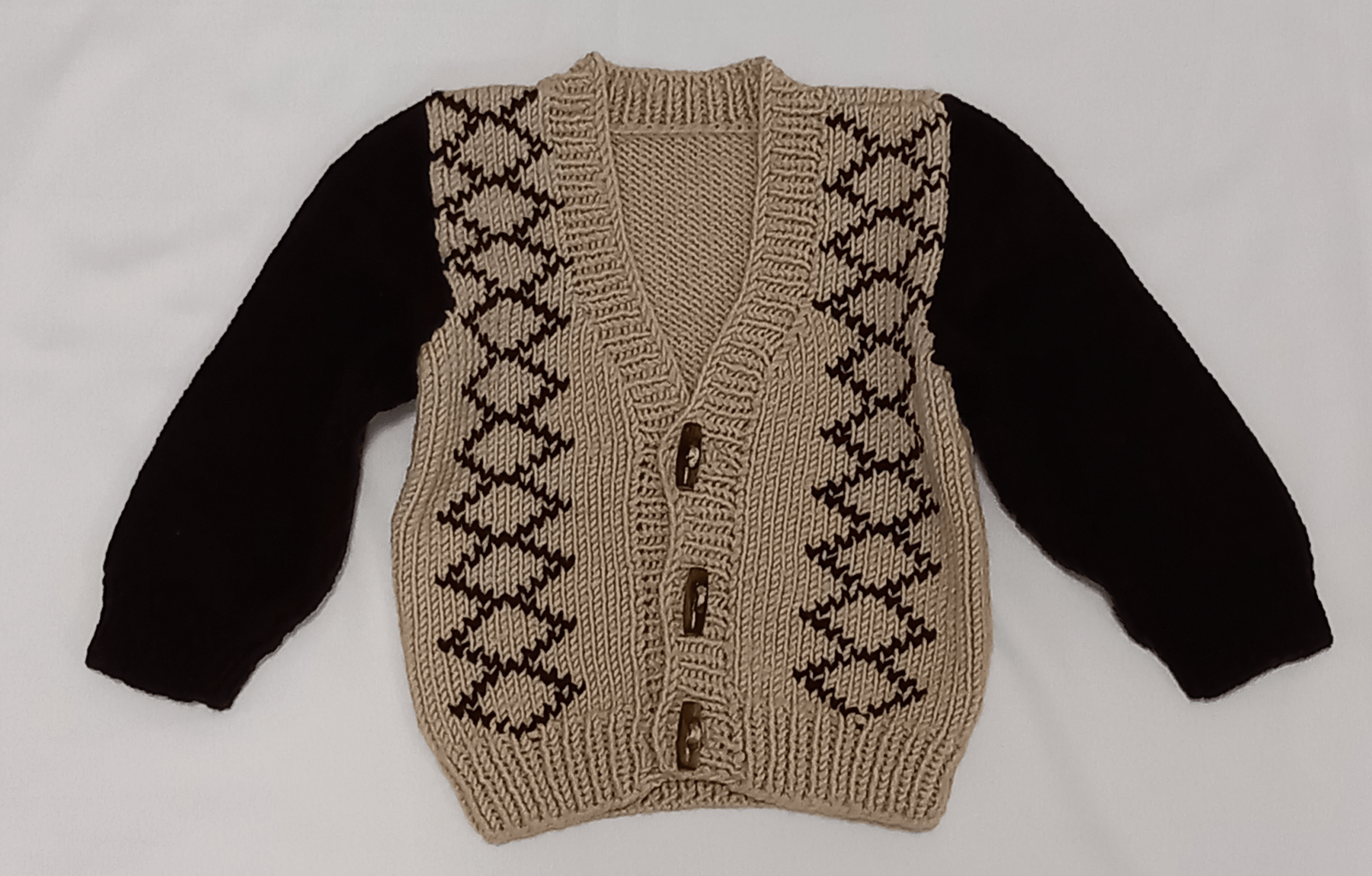 Maglione elegante realizzato in 80% acrilico e 20% cotone . Lavorazione a maglia con dettagli geometrici e bottoni decorativi .