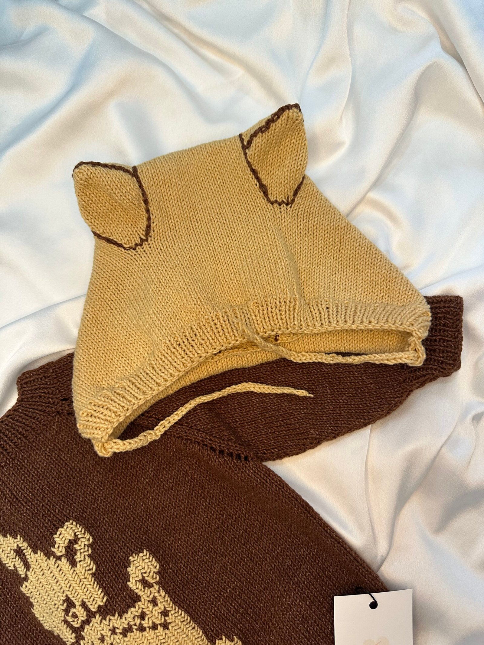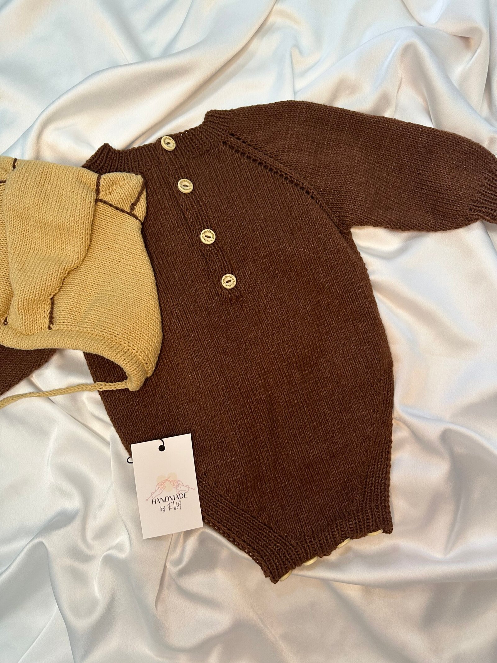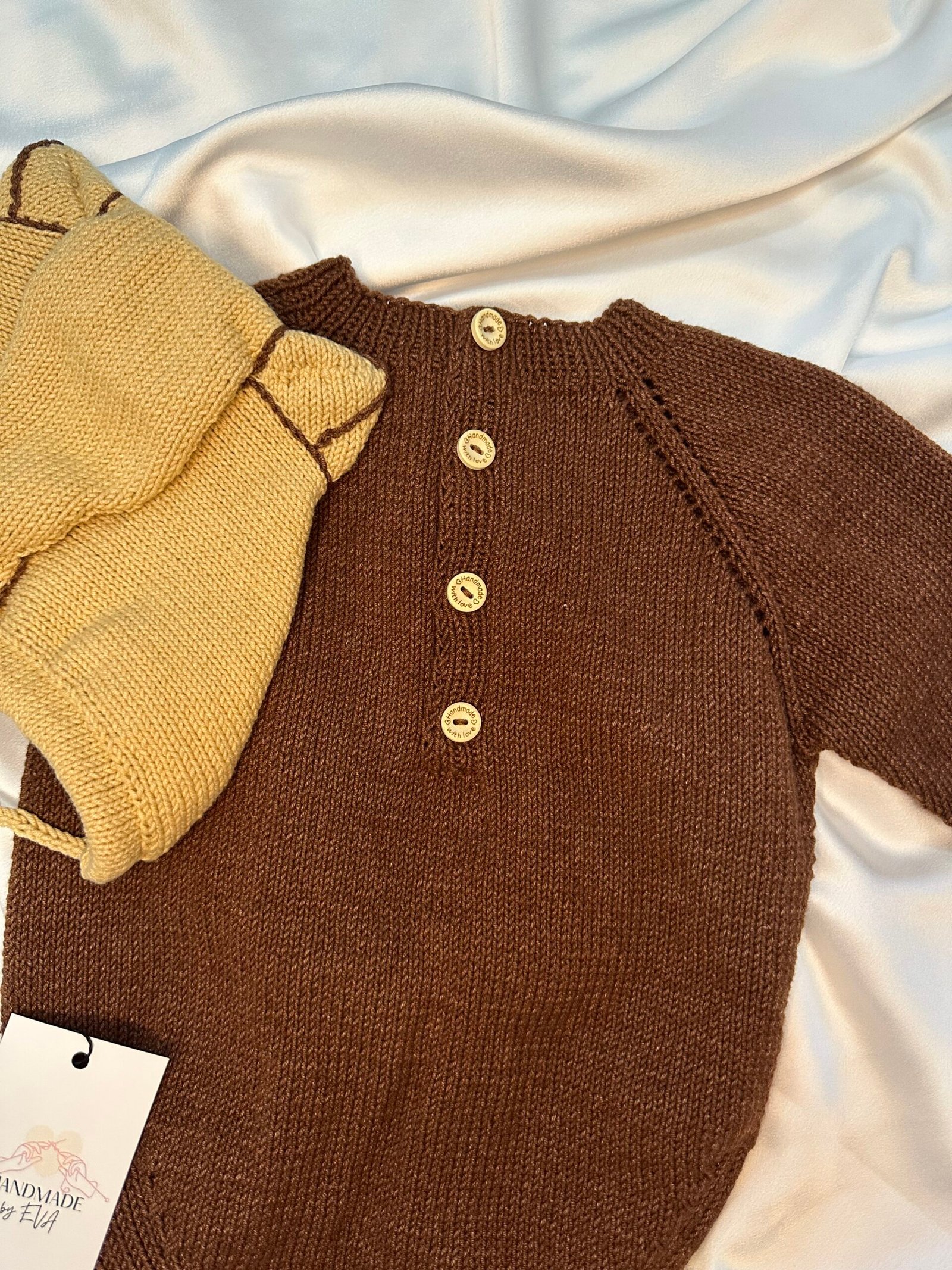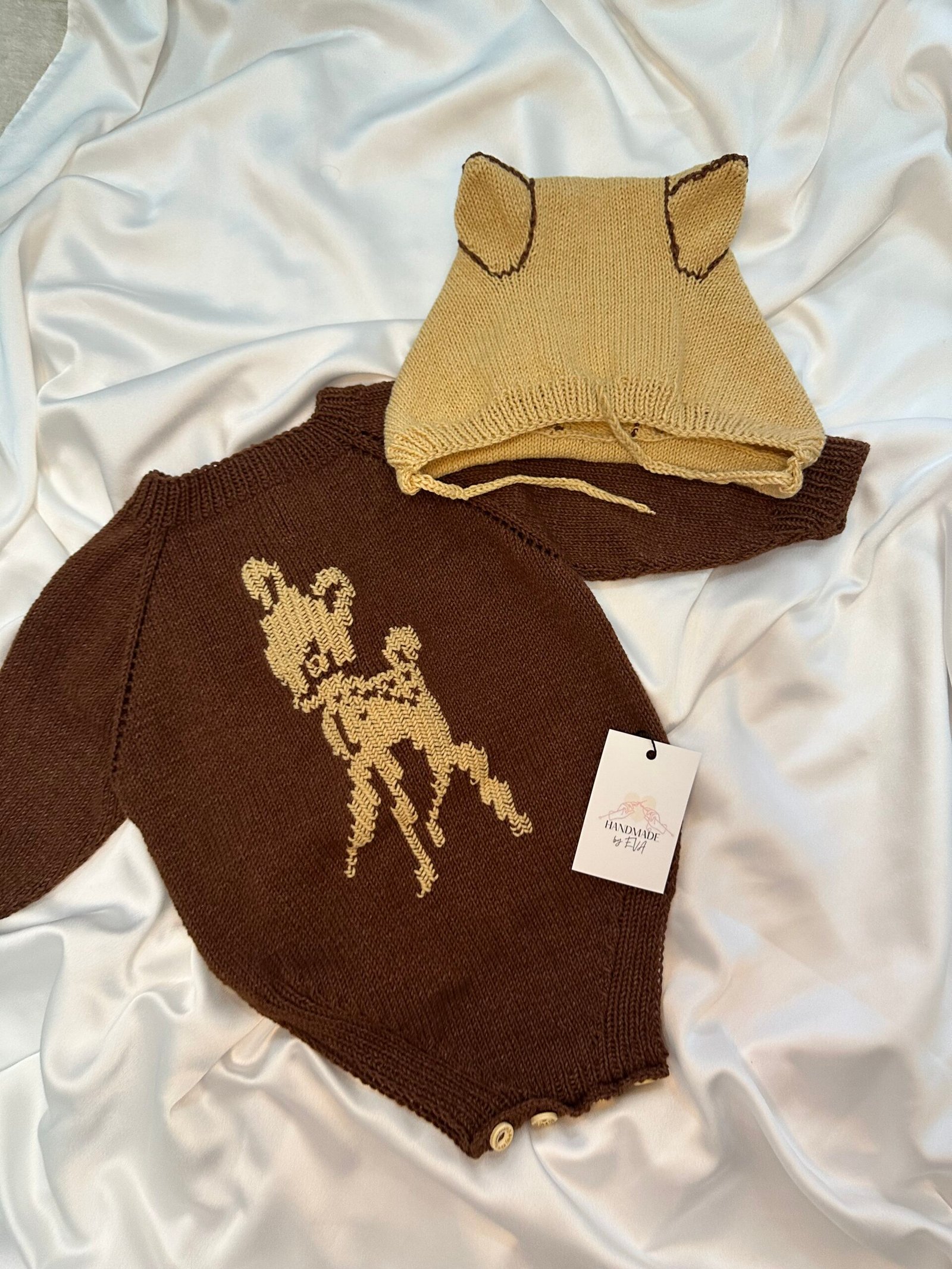 Set artigianale per neonato realizzato a mano con grande cura e attenzione ai dettagli. Il pagliaccetto color marrone presenta un delicato motivo ricamato a forma di cerbiatto, che dona al capo un aspetto dolce ed elegante. Abbinato al cappuccio color beige con graziose orecchiette decorative, il set crea un look armonioso e raffinato.