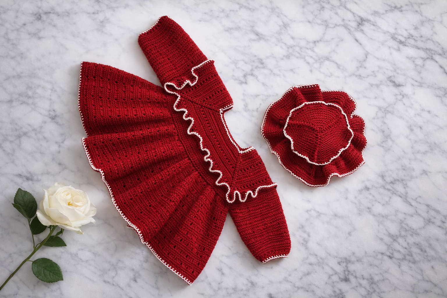 Questo adorabile Serafon, accompagnato da un cappellino coordinato, è stato creato con cura per neonati dai 6 ai 9 mesi. Il design elegante e il colore rosso vivace lo rendono perfetto per occasioni speciali o per aggiungere un tocco di stile al guardaroba quotidiano del tuo bambino. Realizzato con un morbido e confortevole misto di 50% acrilico e 50% cotone, garantisce calore e traspirabilità, ideale per la pelle delicata dei più piccoli. I dettagli raffinati e la lavorazione artigianale conferiscono a questo completo un fascino unico e senza tempo.