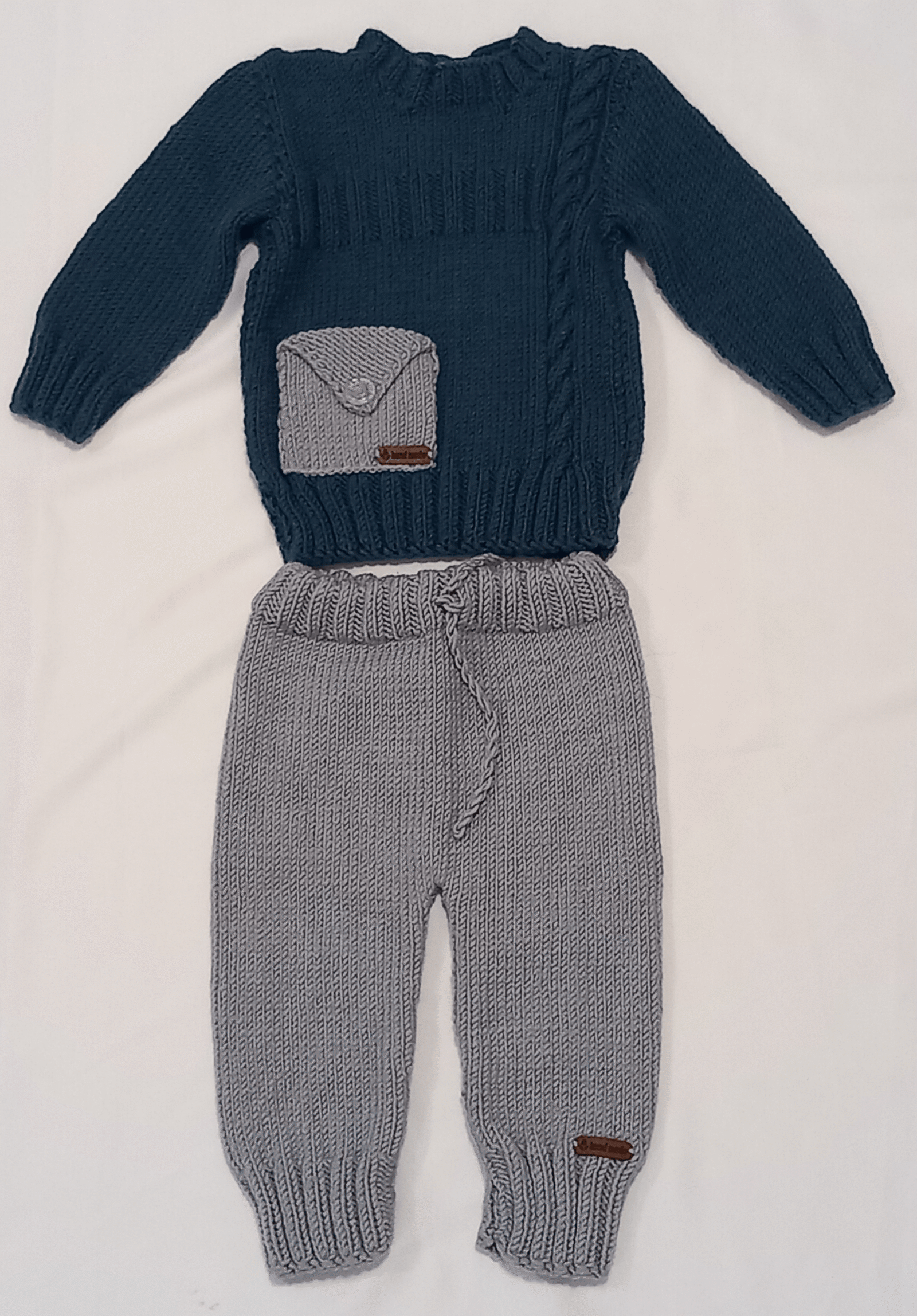 Set elegante composto da maglietta e pantaloni realizzato in 80% acrilico e 20% cotone . Lavorato a mano , morbido e confortevole , ideale per   l’uso quotidiano .